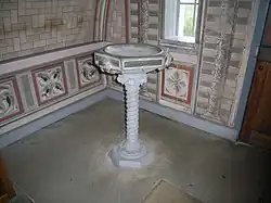 The chapel was constructed from limited materials by the prisoners in the form of a tin tabernacle, and comprises two Nissen huts joined end-to-end. The corrugated interior was then covered with plasterboard and the altar and altar rail were constructed from concrete left over from work on the barriers. Most of the interior decoration was done by Domenico Chiocchetti, a prisoner from Moena in Trentino, northern Italy.[6] He painted the sanctuary end of the chapel and fellow prisoners decorated the entire interior. They created a facade out of concrete, concealing the shape of the hut and making the building look like a church. The light holders were made out of corned beef tins. The baptismal font was made from the inside of a car exhaust covered in a layer of concrete.