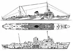 Diana was laid down on 31 May 1939 at the Cantieri Navali del Quarnaro in Fiume, launched on 20 May 1940 and completed on 12 November 1940. The planned main armament consisted of two 90/50 guns, modern anti-aircraft weapons used on the latest Italian battleships but eventually a pair of old 102/35 4-inch guns was fitted in their place. Six 20 mm Breda 20/65 mod. 35 guns completed the anti-aircraft defence. During the war Diana was used as fast transport for valuable cargo.[1]