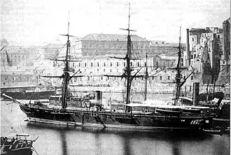 The keel for Etna was laid down at the Regio Cantiere di Castellammare di Stabia (Royal Shipyard of Castellammare di Stabia) shipyard in 1860 for the Real Marina (Royal Navy) of the Kingdom of the Two Sicilies.[1][2] The ship was launched on 17 July 1862,[3] and was completed the following year.[1][2] By that time, the various Italian states, including the Kingdom of the Two Sicilies, had unified as Italy, and so Etna entered service with the Regia Marina.[4]