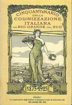 When the fiftieth anniversary of immigration was celebrated in 1925, the state government organized an exhibition in Porto Alegre, bringing the best agro-industrial and artistic products from the colonies, being a success, and at the same time published a substantial collection of critical essays and informative and statistical articles about the Italian presence in the state of Rio Grande do Sul, in two volumes, entitled Cinquantenario della Colonizzazione Italiana nel Rio Grande del Sud, 1875-1925. In it was done a mapping, unprecedented for its comprehensiveness and detail, of the activity of the Italians and their descendants in a long list of cities where they left their marks in the most diverse domains.[1] Also not forgotten was the passing but powerful presence of other Italians such as Tito Livio Zambeccari and Giuseppe Garibaldi.[45]