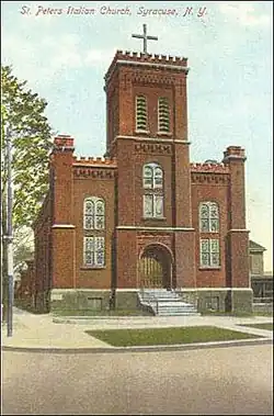 In 1896, St. Peter's Italian Church was a Roman Catholic church located at the corner of Burnet Avenue and Lock Street. (It later moved to 130 North State Street),[9] north of Erie Boulevard East.[10] The Italian congregation had taken over what was originally known as The Church of Messiah, built in 1853 by the Unitarian Congregational Society of Syracuse.
