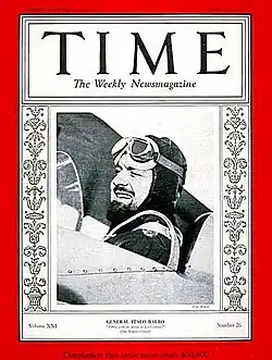 After serving in World War I, Balbo became the leading Fascist party organizer in his home region of Ferrara. He was one of the Quadrumvirs, the four principal architects (Quadrumviri del Fascismo) of the March on Rome that brought Mussolini and the Fascists to power in 1922, along with Michele Bianchi, Emilio De Bono and Cesare Maria De Vecchi. In 1926, he began the task of building the Italian Royal Air Force and took a leading role in popularizing aviation in Italy, and promoting Italian aviation to the world. In 1933, perhaps to relieve tensions surrounding him in Italy, he was given the task of governing Italian Libya, where he resided for the remainder of his life. Balbo, hostile to antisemitism,[1] was among a minority of leading Fascists to oppose Mussolini's alliance with Nazi Germany.[2] Early in World War II, he was killed by friendly fire when his plane was shot down over Tobruk by Italian anti-aircraft guns who misidentified it.[3]