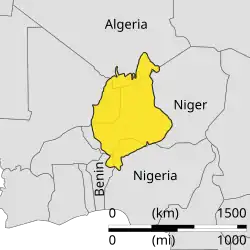 The Iullemmeden Basin (Berber language: Iwellemmedden) is a major sub-Saharan inland basin in West Africa, extending about 1,000 kilometres (620 mi) north to south and 800 kilometres (500 mi) east to west. It covers western Niger and parts of Algeria, Mali and Nigeria. It is named after the Iullemmeden, a federation of Tuareg people who live in the central region of Niger.[1] Its geographic range is largely coincident with the Azawagh region.[2]
