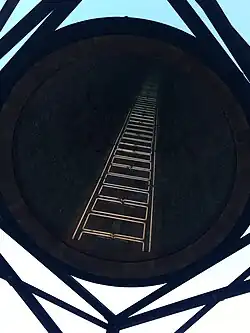Navarro also works with light and infinity mirrors, in which viewers lose themselves in an apparently infinite space as neon phrases or structures loom out and suggest what lies beyond. These abyss-like works can link back to Navarro's fear of being abducted as a child.[5] As he navigates his past, the artist readily admits, "There is a certain amount of fear in my pieces".[5][6] In ‘Criminal Ladder’ (2005), Navarro created a 30-feet-high ladder made with fluorescent light tubes. On the tubes he has written the names of people who committed human rights abuses during the Pinochet time in power.[7][8]