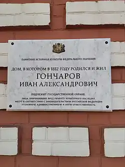 Goncharov was born in Simbirsk (now Ulyanovsk). His father, Aleksander Ivanovich Goncharov, was a wealthy grain merchant and a state official who served several terms as mayor of Simbirsk.[4] The family's big stone manor in the town center occupied a large area and had all the characteristics of a rural manor, with huge barns (packed with wheat and flour) and numerous stables.[5] Alexander Ivanovich died when Ivan was seven years old. He was educated first by his mother, Avdotya Matveevna, and then his godfather Nikolay Nikolayevich Tregubov, a nobleman and a former Russian Navy officer.[4]