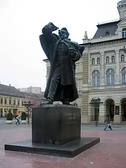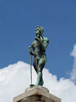 Meštrović became a supporter of Yugoslavism and Yugoslav identity after he traveled to Serbia and became impressed with Serb culture.[6] He created a sculpture of Serbian folk-legend hero Prince Marko for the International Exhibition of Art (1911), which was exhibited along with 73 sculptures at the pavilion of Kingdom of Serbia.[7] When asked about the statue, Meštrović replied "This Marko is our Yugoslav people with its gigantic and noble heart".[6] Meštrović wrote poetry speaking of a "Yugoslav race".[6] Those who knew Meštrović's views referred to him as "The Prophet of Yugoslavism".[6] He also participated in 1911 at the Turin International.