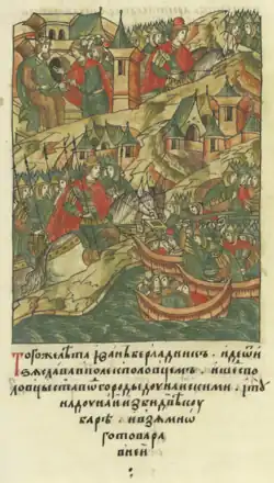 ![]() Ivan robs warships, miniature from the Illustrated Chronicle of Ivan the Terrible (16th century) | |