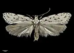 ♀. 32 mm. Head and thorax white. Palpi white, basal half of second segment externally black, also an obscure blackish ring near apex, terminal segment with a sprinkling of black scales forming an indefinite ring at tooth. Antennae fuscous mixed with white, basal segment paler. Abdomen ochreous-whitish, apical segment brown. Legs grey-whitish, tarsi banded with dark fuscous. Forewings elongate, broad, costa well arched, apex obtuse, termen rounded, oblique; white, densely irrorated with pale fuscous; seven blackish spots on costa, first at base, second at 1⁄4, third at 1⁄2, seventh at apex, and remaining three at equal distances between third and seventh; a blackish spot in disc obliquely beyond second costal, and a linear blackish mark on fold beneath this; three blackish spots forming a triangle in disc at about middle, the most apical obliquely beyond third costal; a less clearly defined spot towards apex; a series of blackish spots on termen: fringes white. Hindwings grey-whitish with an undefined dark discal spot: fringes grey-whitish. A very distinct form, larger and without the dark fasciae of the other white species.[3]