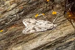 Male. — 21 mm. Head and thorax grey-whitish, sprinkled with fuscous-grey. Palpi grey-whitish, mixed with fuscous, basal half of second joint dark fuscous externally, terminal joint with a slender dark fuscous ring above middle. Antennae grey. Abdomen grey-whitish. Legs dark-fuscous, posterior tibiae with grey-whitish hairs, all tarsi with obscure whitish rings at apex of joints. Forewings elongate, slightly dilated, costa gently arched, apex obtuse, hindmargin oblique, nearly straight; whitish, irregularly irrorated with grey and fuscous scales; these tend to form suffused markings, a spot on middle of inner margin, another above anal angle, a narrow suffusion along posterior half of costa, and an apical patch; a small cloudy darker spot towards hindmargin in middle; a minute black dot in disc at 1⁄3, another slightly above it in middle, and a very small blackish ocellus in disc at 2⁄3 : cilia whitish, with two cloudy grey lines. Hindwings whitish; cilia whitish, with two faint grey lines.[6]