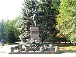 During World War II, Izium was the site of numerous important battles. A Red Army salient was cut off by counterattacking German forces during the Second Battle of Kharkiv and was eliminated in one of the most expensive learning errors for the Red Army.[21] Izium was occupied by the German Army starting on 24 June 1942.[18] The Germans operated a Nazi prison in the city.[22] Izium was liberated by the Red Army on 5 February 1943.[18] In mid-March 1943, German troops attacked Izium again, but were unsuccessful, according to Soviet sources. There were more clashes near the city in summer 1943, during the Izyum–Barvenkovo offensive. Soviet Lieutenant General Pyotr Volokh, commander of the 18th Mechanized Corps that fought on the Izium bridgehead, died in combat in the southern outskirts of the city. On 13 September 1950, after the end of the war, a monument to Volokh was unveiled in Izium.[18] Until 2022, there was also a street named after Volokh.[23]