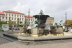 Järntorget ("The Iron Square") was named after the now-demolished scale which once stood on the site. It was used for weighing iron to be exported from the city's harbour. The former site of the scale is now occupied by a large, granite fountain called De fem världsdelarna. The fountain includes sculptures featuring five bronze naked, female figures representing five continents: Africa, America, Asia, Europe and Oceania. The fountain and the sculptures were the work of Swedish sculptor Tore Strindberg (1882–1968). The plinth in the centre of the fountain is decorated with the stamps which were used by the large number of Swedish iron merchants which once traded in the city. The fountain was first erected in 1927 and has been moved twice since then.[2][3]