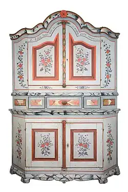 As a decorative painter of furniture his regular motif was flowers and leaves, usually on a blue background.[1] He would also make decorative "Forsa doors" in rococo-style, painted in white with thick, protruding door panels.[3] The light blue tint used by Månnson was a mixture of indigo dye and white lead. For decorative painting he would also use darker shades of blue, from pure indigo or prussian blue, a dark red based on hematite, as well as orange and yellow from cinnabar and yellow ochre respectively.[4] He would use techniques such as marbleizing and graining with skill.[5]
