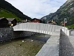 - The first was a 47-metre (154 ft) wood-and-rope truss bridge known as the Traversinersteg I, completed in 1996 but destroyed in a March 1999 rockslide.[3][4] The first Traversinersteg bridge was prefabricated as a single assembly and lifted into place by what was then Switzerland's most powerful helicopter.[5]
