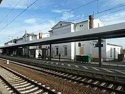 The Military Railway station is located north-east of the main station on the side of the railway tracks. Its entrance building is a three-storey yellow brick building with a two-storey extension with a display gable on the track side and a staircase to the forecourt in an avant-corps.