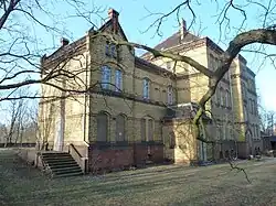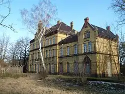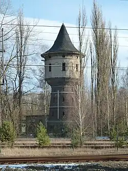The listed water tower, built between 1915 and 1917, is located in the western part of the site. It is a red-brick building, tapering upwards, with a reservoir room with wrought-iron decorations. Its technical equipment was maintained even after the end of its use as a water tower. The heritage-listed monument is one of the few preserved technical monuments in Jüterbog.[15]