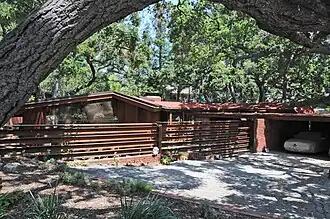 The J. W. Schaffer House is on the northeast edge of the Verdugo Mountains, in the Whiting Woods neighborhood of Glendale, California. The house, constructed in 1949, is an example of the Wrightian-influenced Mid-Century Modern architecture of master architect John Lautner.[1] The house exhibits the modest scale and massing, horizontal emphasis, large expanses of glass, and asymmetrical plan associated with Mid-century Modern houses, along with a connection to outdoors and focus on the specific site conditions of Organic architecture.[2]