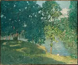 Weir gained further notoriety and in 1893, the American Art Association grouped his works together with those by Twachtman for a comparative exhibit with pieces done by Claude Monet and Paul Besnard.[6] Such a prestigious event meant that the art world had taken notice of the American brand of Impressionism. Furthermore, Weir felt compassion for those who lost their jobs in the 1893 depression. Railroad bankruptcies led to unemployed workers, but Weir helped raise money for them with painting exhibitions.[11]