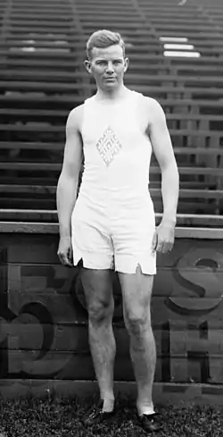J. Ira Courtney was born in Minneapolis, Minnesota. According to Jim Daves, the author of The Glory of Washington (his book about the University of Washington), it was there that young Ira first discovered his talent for sprinting when he and his brother outran some policemen when they were caught filching fruit in an orchard. After moving with his family to Seattle, Washington, Courtney competed on the Broadway High School track team.[4] In 1909, he was the captain of Washington’s West Side Team in the state championship meet, where he won the low hurdles, and all three sprinting events, setting a new state record in the 220-yard dash of 22 and one-fifth of a second. (This was in the days long before modern technology, which now allows races to be recorded in one-hundredths of a second.) He also competed on Broadway’s swimming, baseball, and football teams. Courtney's victory in the 220-yard low hurdles on May 1, 1909, was the decisive race in Broadway's one-point victory over cross-town rival Lincoln High School. Later that year, he competed in track events for the Seattle Athletic Club.