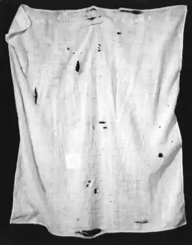 Priola's "Paradise" (1993–94) and "Saved" (1995–97) series consisted of small photographs (the former group in a round format) of everyday objects and odd personal mementos—jewel box, old notebook, fragment of lace, broken plastic horse—isolated against depthless black space.[31][32][33][8] Los Angeles Times critic Susan Kandel observed "they function as allegories of the photographic project itself… Ordinary things are rendered extraordinary in and through the processes of representation … Meaning is conceived as an after-effect, a residue of form."[32] Reviews characterized "Saved" images (e.g., Dish Towel, 1995) as haunting, somber and commemorative: "exceedingly humble object(s) … transformed by the artist into a thing of wonder and nobility" with wounds and usage matter-of-factly on display.[8][35][36]
