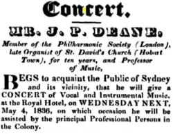 - ^ "Mr Deane's Concert". The Maitland Mercury and Hunter River General Advertiser. Vol. III, no. 115. New South Wales, Australia. 15 March 1845. p. 2. Retrieved 17 January 2024 – via National Library of Australia.