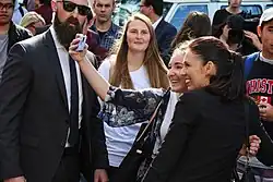 Ardern put forward her name for the Labour nomination for the Mount Albert by-election to be held in February 2017[54] following the resignation of David Shearer on 8 December 2016. When nominations for the Labour Party closed on 12 January 2017, Ardern was the only nominee and was selected unopposed. On 21 January, Ardern participated in the 2017 Women's March, a worldwide protest in opposition to Donald Trump, the newly inaugurated president of the United States.[55] She was confirmed as Labour's candidate at a meeting on 22 January.[56][57] Ardern won a landslide victory, gaining 77 per cent of votes cast in the preliminary results.[58][59]