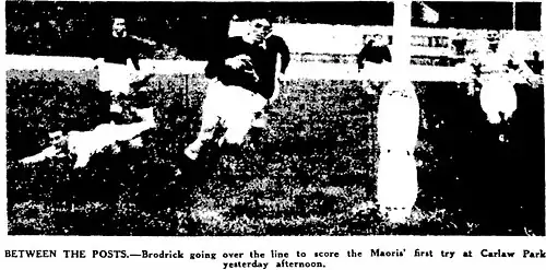 It was reported after the tour that Brodrick and George Harrison were the two fastest players in the team and "with their brilliant speed, were always the worry of the opposition. Brodrick found his place as a permanent loose forward following a race over 60 yards in which he and Harrison beat the remaining members of the touring party".[55] Brodrick's first match was against Toowoomba on 17 July in front of 3,000 spectators. They won 35 to 13 with it reported in the Te Puke Times that along with the Māori side playing spectacularly “another Maori find was Brodrick, who is sure to be picked to play against Queensland on Saturday”.[56] The Courier Mail said afterwards, looking at the team named to play Queensland that “another important pack change will be the inclusion of Broderick, who surprised the managers with his sterling performance at Toowoomba”. And that the team had all recovered from influenza and would be at full strength for the second match against Queensland.[57] The strengthened Māori side won 15 to 13 on 20 July before 10,000 in Brisbane, with Brodrick scoring a try which clinched the match. It was said that “Harrison and Cooper were in particularly good form with Broderick and Mataira next”.[58] Brodrick's try with Hemi's conversion made the score 15–10 in their favour before a Queensland penalty narrowed the margin to the final score.[59] His try came after a movement started by Harrison with Brodrick, Whiteley and Mataira also involved at the head of the raid. At the end of it Brodrick got a “favourable bounce” to collect and go over.[60] Early in the match Brodrick, playing in the loose forwards, had been involved in a movement with Mataira and Whiu which carried the play well into Queensland territory.[61]