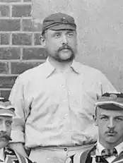 Crossland was named in the initial twelve-man squad for the first Test against Australia, which was played at Lancashire's Old Trafford ground. An official from the home ground chose the England team for each match. Lord Harris announced that he would not participate in the Test at Old Trafford if Crossland was selected. As a result, Lord Harris was withdrawn from the team and replaced by Tim O'Brien, although in the end Crossland did not play either.[56] Lord Harris, who was both the captain of Kent and England in 1884, led the protests against throwing.[57] He forced the retirement of two of Kent's bowlers,[58] but was reasonably satisfied with Lancashire in 1884: for their match against Kent at Old Trafford, they dropped Nash,[47] and by the meeting of the two sides in August that year, neither Crossland nor Nash were in the side.[59] Lord Harris had hoped that this indicated that Lancashire were making efforts to "of [their] own free will, and without agreement with other counties, to place [their] eleven in an irreproachable position",[46] though Lancashire later clarified that Crossland had only missed the match as he was suffering from a shoulder injury; while Nash's bowling was not suited to the hard pitches those matches were played on.[60] Crowd protests against Crossland spread; there was trouble during matches at both Yorkshire and Derbyshire in 1884.[61] Towards the end of that season, the London Truth reported that during a club match in his home town of Sutton-in-Ashfield, Crossland was no-balled by an umpire on account of throwing. Upon this, Crossland demanded the umpire retire from the match, and when the opposing captain refused, the match was abandoned. Crossland then announced, via the town crier, that his bowling would "pass unquestioned" in his next county match.[62]