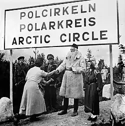 Passenger with SNLC cruise train greeting "kung Bore", the Swedish equivalent of Jack Frost, during a stop at the arctic circle in Sweden, 1950s.