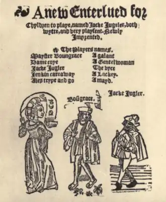 Jack Juggler (full title: A new Enterlued for Chyldren to playe, named Jacke Jugeler, both wytte, and very pleysent) is an anonymous sixteenth-century comic interlude, considered to be one of the earliest examples of comedy in English alongside Ralph Roister Doister and Gammer Gurton's Needle. The play is believed to have been written sometime between 1553 and 1561 and was first published in 1562.[1] The author of the play is uncertain, however it has been proposed to be the work of the London schoolmaster, Nicholas Udall.[2] As the full title indicates, the play was most likely performed by a troupe of child-actors possibly at court during the Christmas season.[3] The plot is an adaptation of a section of the play Amphitryon by the Roman comic playwright Plautus.