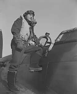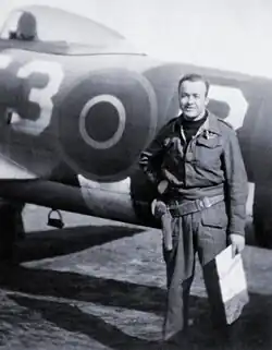 On six occasions, he flew three sorties in one day: 17 June, 24 June, 9 August and 18 August at the height of the Battle of Falaise, 30 September and 2 October 1944.[6] Overseas, on 4 June 1944, S/L F.G. Grant described him as a "Particularly good flight commander on the ground and outstanding in the air. Confident and self-assured on operations".[3] On 27 October 1944, Group Captain Paul Davoud D.S.O., O.B.E., D.F.C. wrote that he was "A fine organizer and a brilliant fighter-bomber leader whose judgement was outstanding".[3]