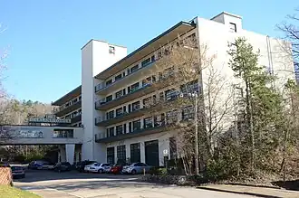 An elevated pedestrian bridge joins the main hotel to the bathhouse, across Oriole Street. The hotel was built in 1950 by Vance Bryan to a design by local architect Irven McDaniel, and is a rare surviving example of a 1950s hotel in Hot Springs.[2] The building now houses a senior living facility known as the Garland Towers.