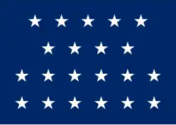 The introduction of the Union Jack design, "comprising the national ensign's blue field and white stars";[17] examples of many layouts of the 13-star pattern exist (see Flag of the United States). |
