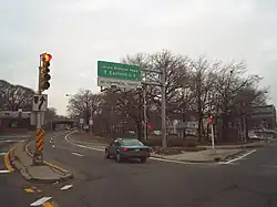 The Jackie Robinson Parkway starts at an intersection with Jamaica, Pennsylvania, and Bushwick avenues in the East New York neighborhood in Brooklyn. The westernmost four exits are located within the Cemetery Belt, near Brooklyn's border with Queens.[3] The parkway runs east from Bushwick Avenue to Highland Park, where it curves around the north side of the Ridgewood Reservoir. Exit 1, Highland Boulevard, is a westbound exit and eastbound entrance. The parkway passes Mount Judah Cemetery before exit 2 at Vermont Place and Cypress Avenue, which lead to Highland Park and the Hungarian Cemetery. The parkway then continues through Mount Carmel Cemetery and Cypress Hills Cemetery,[3] where there are retaining walls on both sides of the highway.[4] Exit 3, Cypress Hills Street, leads to Cypress Hills Cemetery, where Jackie Robinson is buried.[3]
