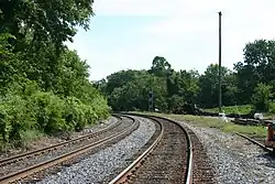 Historian Angus James Johnston, II, "To make sure the trains stayed trapped and to prevent Union armies under George B. McClellan and Robert Patterson from using the road, the Confederates [still officially Virginia Militia] began destroying bridges and track on May 25," taking down seventeen bridges over the next thirty-day period.[1] The main stem of the B&O which ran mostly in or near Virginia was severed and cut off from the rest of the line by blasting a "massive rock formation onto the track at Point of Rocks."[1] Johnston made the determination that in fact no rail traffic passed the B&O main stem west of Point of Rocks after the end of May, and west of Opequon Creek Bridge two miles (3.2 km) east of Martinsburg after June 2.