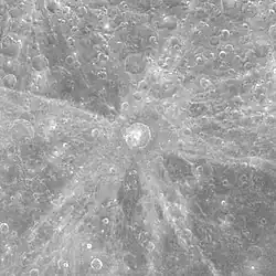 This crater created a large ray system. A skirt of higher-albedo material covers the surface within one crater diameter, with a slightly darker band along the outer ramparts. Beyond that radius, the rays form wide sections that grow increasingly diffuse and wispy with distance. The largest sections lie in roughly 90° arcs to the northeast and southwest, while a narrower arc projects to the south-southeast. The rays continue for hundreds of kilometers across the surface.