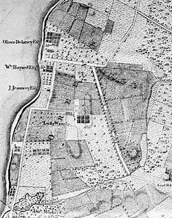 By the late 18th century the footpaths had evolved into roads, with connecting roads emerging to the north. The city's first war memorial was erected in 1762 among farmland at the northern terminus of Greenwich Avenue (known then as Monument Lane) a few hundred feet north of what is now Jackson Square Park. It was an obelisk honoring British Major General James Wolfe who died in the Battle of Quebec. By 1773, the monument no longer appeared on local survey maps, though why it was dismantled is unknown.[4][5]