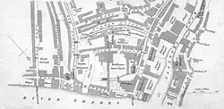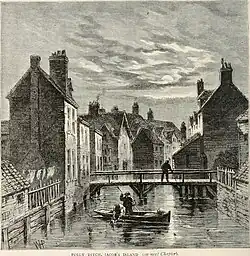 In the 1840s it became "a site of radical activity",[3] and, after attention from novelists Charles Dickens and Charles Kingsley, joined other London areas of "literary-criminal notoriety" that emerged "as symbols of a developing urban counterculture".[4] The 19th-century social researcher Henry Mayhew described Jacob's Island as a "pest island" with "literally the smell of a graveyard" and "crazy and rotten bridges" crossing the tidal ditches, with drains from houses discharging directly into them, and the water harbouring masses of rotting weed, animal carcasses and dead fish.[5] He describes the water being "as red as blood" in some parts, as a result of pollutant tanning agents from the leather dressers in the area.[5][6]