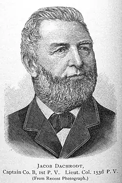 Jacob Dachrodt (1828-1909) was an American Civil War hero who served as the captain of the 1st Pennsylvania Infantry Regiment's Company B during the Battle of Gettysburg. Following his reenlistment with the 153rd Pennsylvania Infantry Regiment, he was subsequently commissioned as the regiment's lieutenant colonel.[1][2]