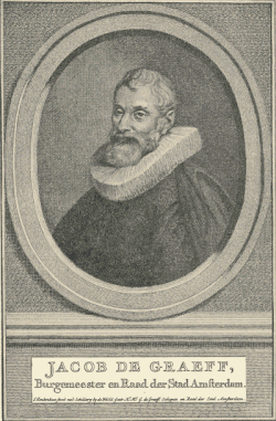 After the death of De Graeff's father in 1589, his father's friend Cornelis Andriesz Boelens Loen - whose daughter Aaltje he later married - acted as his provider.[16] Jacob Dircksz de Graeff studied Classical language at Leiden University. During his student days he lived in the house of professor Rudolf Snellius. In 1591 he undertook a grand tour of France, Italy and Germany with his friend Justus Lipsius and then lived in Geneva for three years in the house of the Calvinist preacher Giovanni Diodati.[9][16] In 1597 De Graeff returned to Amsterdam and in the following year he became Schepen (alderman) and from 1603 a member of the Vroedschap.[9] The following year he became ambachtsheer of Amstelveen, Nieuwer-Amstel, Sloten, Sloterdijk and Osdorp on behalf of the city of Amsterdam. After his death, his son Cornelis de Graeff received this fiefdoms. As early as 1610, De Graeff brought the Protestant preacher Johannes Cornelisz Sylvius to Amsterdam. In 1611 he was also elected one of the four burgomasters (mayor) of Amsterdam for the first time.[9][16] That year he was also present at the meeting of Prince Maurits of Oranje and Frederick Hendrik of Oranje in the Beemster area newly retaken from the Spanish.[16] In 1612 he became a colonel in the Amsterdam Civil Guard.[9] When the Remonstrant Simon Episcopius was summoned before the mayors in 1613, De Graeff was one of his most ardent opponents, although he later maintained an intimate relationship with him and the Remonstrants.[16] He was friends with burgomaster Cornelis Hooft, and competed with him on a committee on the city of Amsterdam's expansion plans against "self-seeking" land speculators Frans Hendricksz Oetgens van Waveren and Bartholt Cromhout.[9] De Graeff himself owned much land within the city and ensured that his land was conveniently located for the new roads and canals in the new Jordaan area.[17] At this time, a powerful Calvinist faction under Reynier Pauw crystallized in the Vroedschap, to which De Graeff and his ally Hooft kept their distance, and thus diminished their own influence.