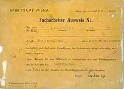 A faded work permit for Uri Elichski, a Jewish worker in the Vilnius Ghetto (October 1941)