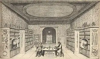 His collection drew the interest of the Russian tsar Peter the Great, who visited de Wilde's home on 13 December 1697 (the eve of de Wilde's birthday[6]) during his "Grand Embassy" of Western Europe.[b] De Wilde's daughter Maria made an engraving of the meeting between Peter and her father, providing visual evidence of "the beginning of the West European classical tradition in Russia",[12] which she presented to Peter on his second visit, on the same date in 1717.[6] In the engraving, two men sit facing each other across a table surrounded by book cases and scientific instruments (de Wilde was proud of his interest in and experience with astronomy[6]); the tsar, on the right, can be identified by the double-headed eagle at his feet, an element of the coat of arms of Russia.[12] In back is a "cabinet/altar".[13] Scotsman Robert Erskine (1677–1718), chief physician and adviser to Peter the Great, studied de Wilde's collection (and many others) in the planning and design of the tsar's Kunstkamera.[13] The Alsatian Johann Daniel Schumacher, Erskine's secretary and court librarian in Saint Petersburg, visited the collection in 1721, reportedly a few months after de Wilde's death.[3]