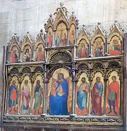 While he apparently trained in Venice, there are no identifiable works there. He is best known for a large and colorful polyptych of the Virgin and Child with 14 Saints (1385), located at Santarcangelo di Romagna.[4] It is housed in the Civic Museum in the Palazzo Cenci of Santarcangelo. Some art critics suggest the influence of Lorenzo Veneziano. Other sources point to him working for or alongside Giovanni da Bologna.[5]