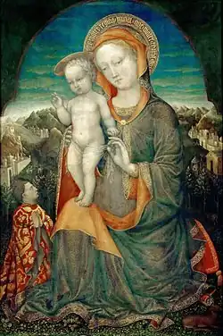 Many of his greatest works, including the enormous Crucifixion in the cathedral of Verona (1436), have disappeared. From c. 1430 is the panel with Madonna and Child, in the Accademia Carrara, once attributed to Gentile da Fabriano. In 1441, at Ferrara, where he was at the service of Leonello d'Este together with Leon Battista Alberti, he executed a portrait of that Marquess, now lost. Of this period survives the Madonna dell'Umiltà, probably commissioned by one of the brothers of Leonello.[2]