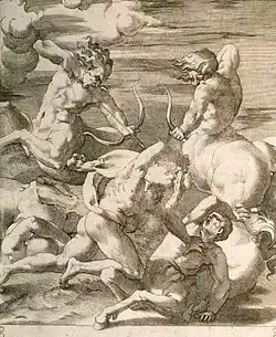 - Set of The Labours of Hercules (Bartsch 44–49), after Rosso,[26] including Hercules piercing with his Arrows the Centaur Nessus; Hercules slaying Cacus