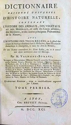 Jacques-Christophe Valmont de Bomare (born 17 September 1731, Rouen; died 24 August 1807, Paris) was a French botanist and naturalist.[1] He wrote an influential encyclopedia of natural history in the 1760s: Dictionnaire raisonné universel d’histoire naturelle (6 volumes, Paris, Chez Lacombe, 1764–1768).[2]