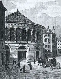 Legrand undertook public and private commissions, and also wrote as an art critic.[6] The Minister of the Interior gave Legrand the task of restoring the monuments of Paris.[6] The prefect of the department assigned him to the committee charged with supervising buildings.[7] Legrand and Molinos built the Cloth Hall in 1786, destroyed in 1855.[3] The cloth market vault was supported on terracotta tubes, and the roof was covered with copper. In its day the cloth market roof was almost as well known as the dome of the corn market.[8] Legrand and Molinos worked on developing the Paris markets, and also designed the Théâtre Feydeau in the rue de Richelieu.[2]