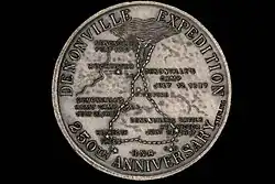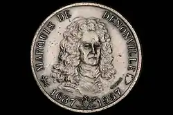 A medal commemorating the 250th anniversary of the 1687 Denonville Expedition was created by the Rochester Numismatic Association in 1937.[13] The obverse has an image of the Marquis de Denonville while the reverse shows the timeline and path of the expedition.