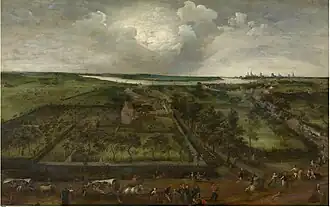 Jacob's extant pictures show explicit connection to the region around Antwerp.[8] Some of his views of Antwerp adhere to the "town-and-country" format, a kind of combination of a rural view with a city view. An example is his panoramic View of the Kiel (1578, Royal Museum of Fine Arts Antwerp) where the city appears only on the far-right distance. Another example is the View of the Scheldt near Antwerp (1587, Royal Museum of Fine Arts Antwerp), which depicts a somewhat different aspect of country pastimes. Only in the distant horizon are the towers of Antwerp visible.[13]