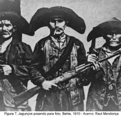 A jagunço (Portuguese pronunciation: [ʒaˈɡũsu]), from the Portuguese zarguncho (a weapon of African origin, similar to a short lance or chuzo), is an armed band or bodyguard, usually hired by plantation owners and "colonels" in the backlands of Brazil, especially in Northeastern Brazil.[1] They were hired to protect their employer, big land owner, against invaders and feudal enemies, and also to control their slaves and indentured servants. Some farmers formed their own private militias with a number of heavily armed jagunços. There were also free-lancing or mercenary jagunços, who could be hired for temporary conflicts, as vigilantes, or for contract murders. Local folklore says that jagunços with yellow eyes were particularly fearsome and efficient.