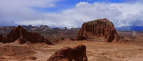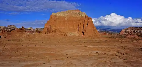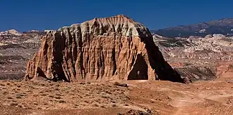 Jailhouse Rock is composed of reddish Entrada Sandstone with a hard, grayish-green sandstone and siltstone Curtis Formation layer caprock which protects it from erosion.[6] The sandstone, which was originally deposited as sandy mud on a tidal flat, is believed to have formed about 160 million years ago during the Jurassic period as a giant sand sea, the largest in Earth's history.[7] Long after these sedimentary rocks were deposited, the Colorado Plateau was uplifted relatively evenly, keeping the layers roughly horizontal, but Capitol Reef is an exception because of the Waterpocket Fold, a classic monocline, which formed between 50 and 70 million years ago during the Laramide Orogeny.[8]